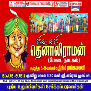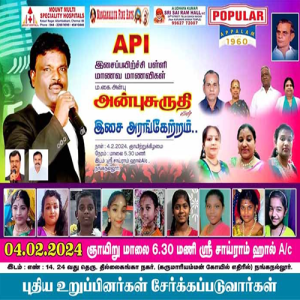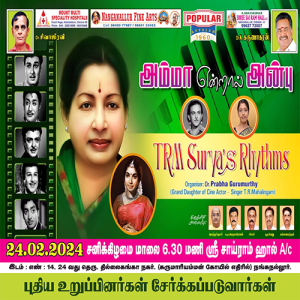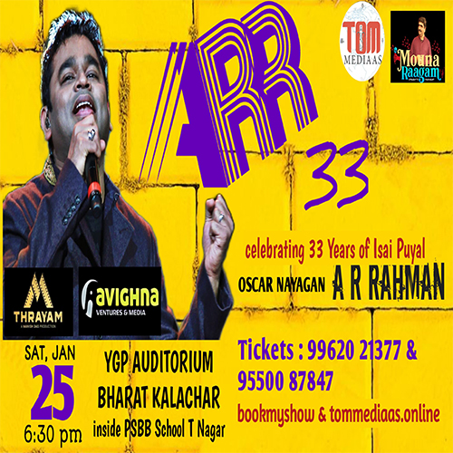 A grand musical concert featuring super hit tamil songs of Shri. AR RAHMAN celebrating his 33 successful years in INDIAN CINEMA. Many young and energetic singers will be performing live along with world class musicians of Mouna Raagam Murali`s orchestra