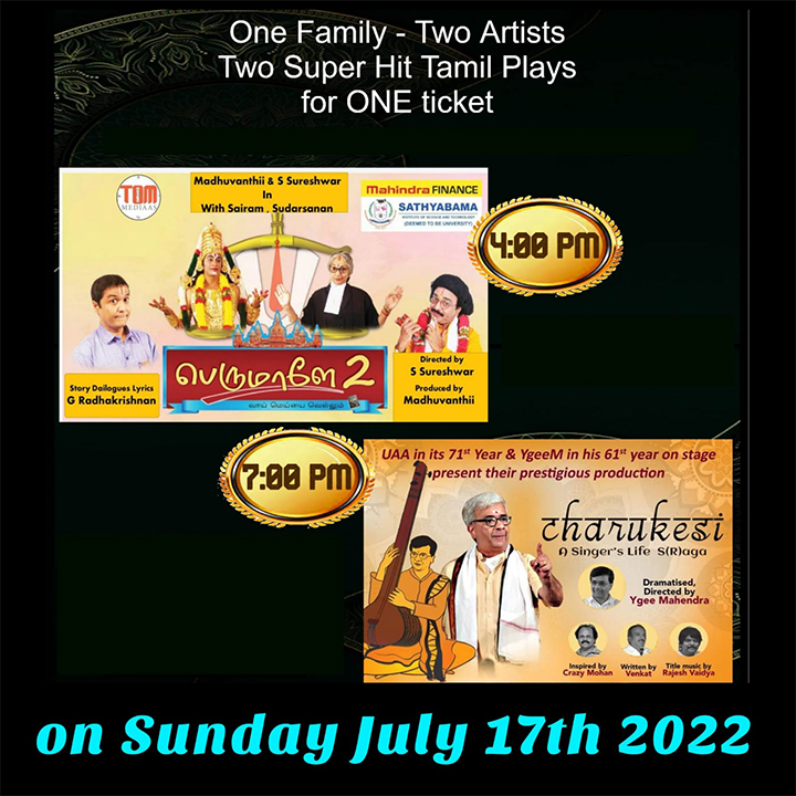 CHARUKESI the new stage production by UAA in its 70th year and Ygee Mahendra in his 60th year on Stage. It is a Carnatic Musician`s Life S(R)Aga Story Inspired by Crazy Mohan Written by Venkat Dramatised & Directed by YGEEM...Performed by the top artistes of UAA. Title Music is by Rajhesh Vaidhya and Background Score by Hindu Bala A powerful story laced with UAA`s brand of Classy Humour and a liberal dose of Classical Music. A Must See For All Theatre Lovers.