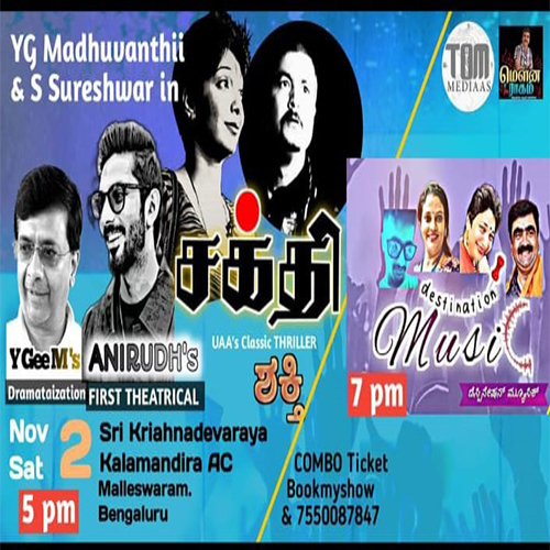 Shakthi: Shakthi is a crime thriller based on the very popular Hollywood movie Wait Until Dark starring Audrey Hepburn and Allan Arkin It’s the story of how a visually impaired woman fights her way through a very sinister plot set by three villains all by herself and comes out successful we at TOM Medias as thrilled to be representing this play The play has been dramatized by Shri YGEE Mahendra and directed by YG Madhuvanthii with stellar performances by Madhuvanthii and S Sureshwar who is the co-director of the play as well along with the talented artistes of TOM Mediaas A very interesting element to this play is the music composed exclusively for this play by ROCK STAR ANIRUDH. Do come and enjoy this crime thriller and celebrate good Tamil Theatre.